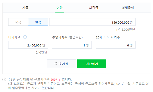 본인 포함한 부양가족수나 20세 이하의 자녀수 등 상황에 따라 달라질수 있으므로 조건에 맞게 간단하게 입력하시면 됩니다. 연봉 1억5천 실수령액 외에도 퇴직금이나 실업급여 등을 계산해 보실수 있습니다.